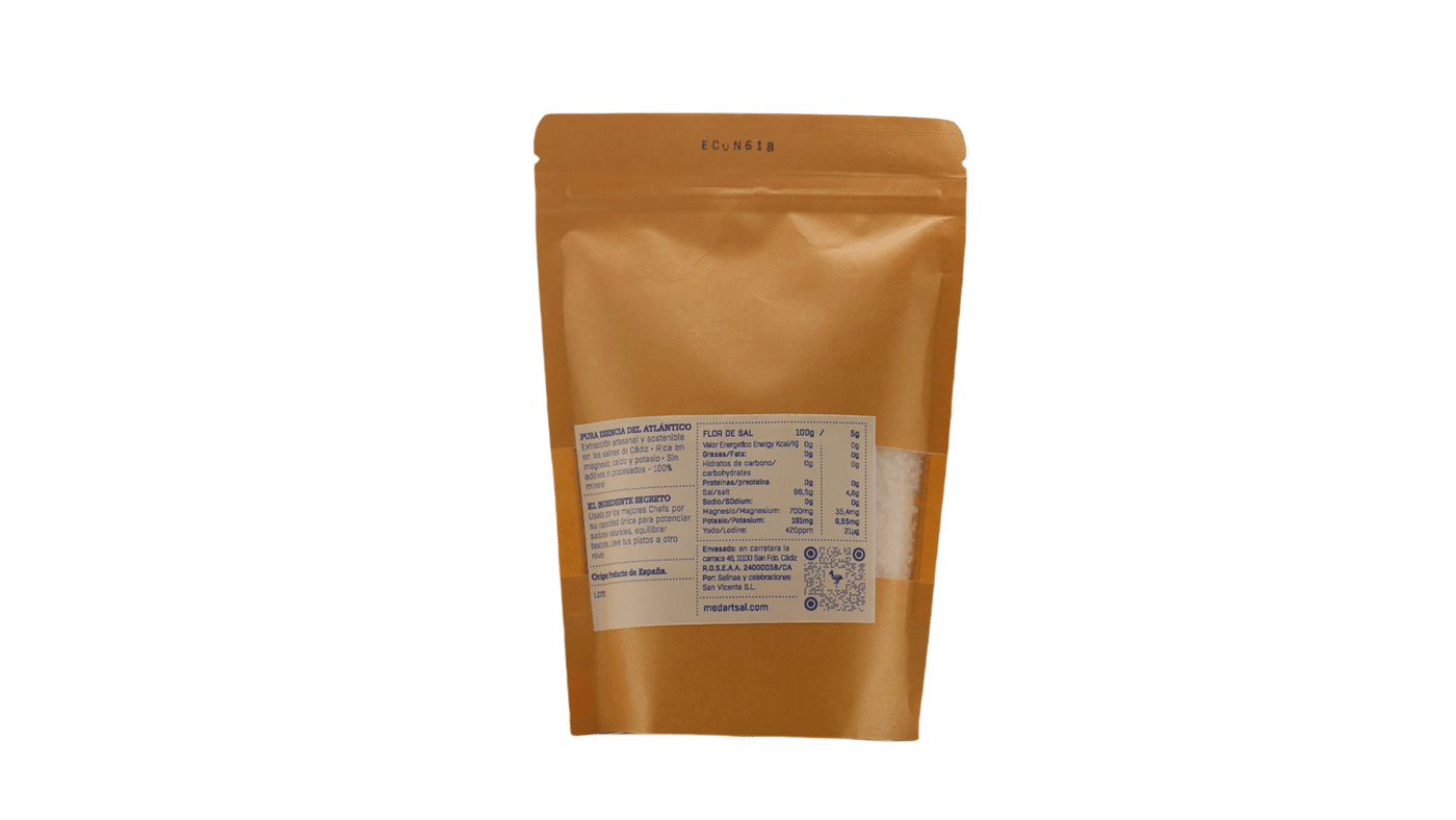 Flor de Sal con textura crujiente y sabor sutilmente salino, realza los sabores sin enmascararlos, convirtiéndose en el toque final perfecto para carnes, pescados, ensaladas y postres. Más que una sal, es una experiencia sensorial que encierra la esencia del mar y la luz del sur.